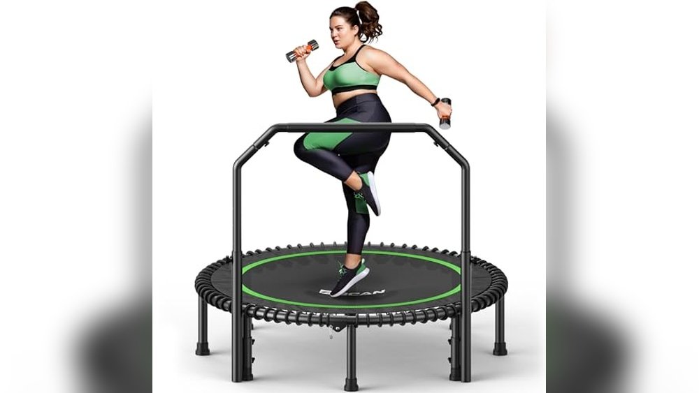 If you want a compact and stable indoor trampoline with a supportive handle for balance, this model fits well. It’s especially good for adults focused on whole-body workouts and gentle cardio at home.